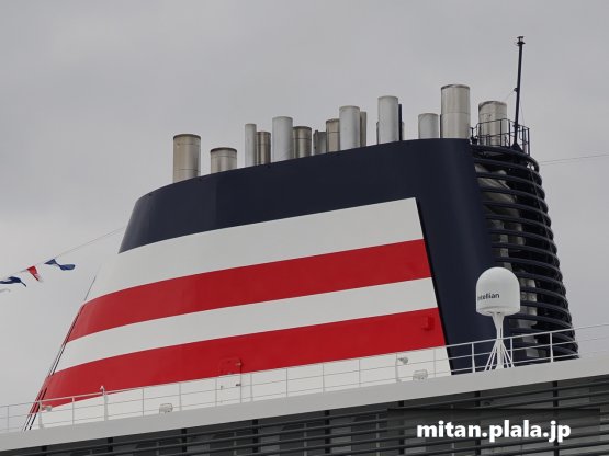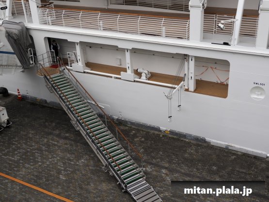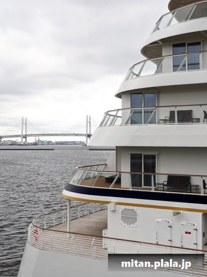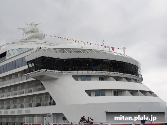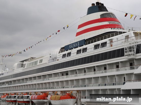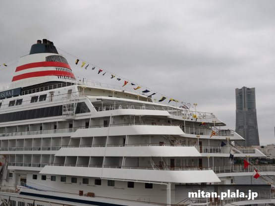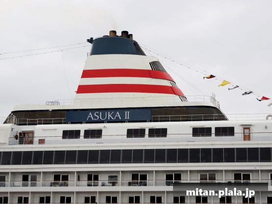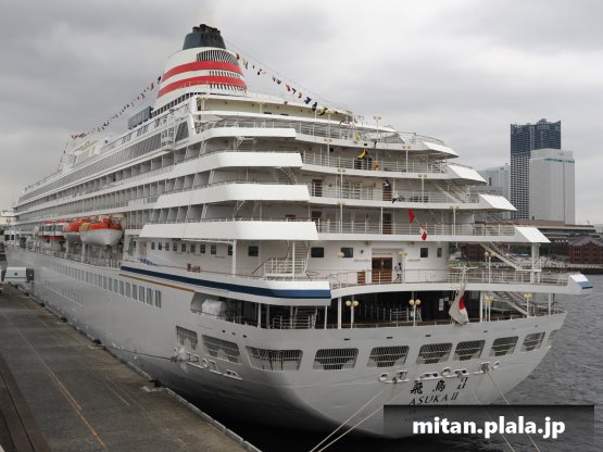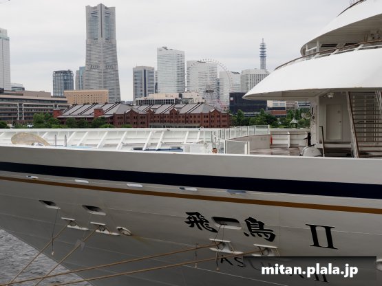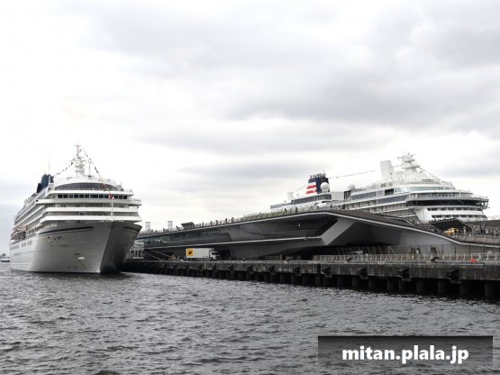 大さん橋に客船が停泊するときは、船の左舷を桟橋につけるのが定石ですが、なぜか、この時は飛鳥IIIは右舷をつけていたので、二つの船が同じ向きというこれもレアな光景が見れました。